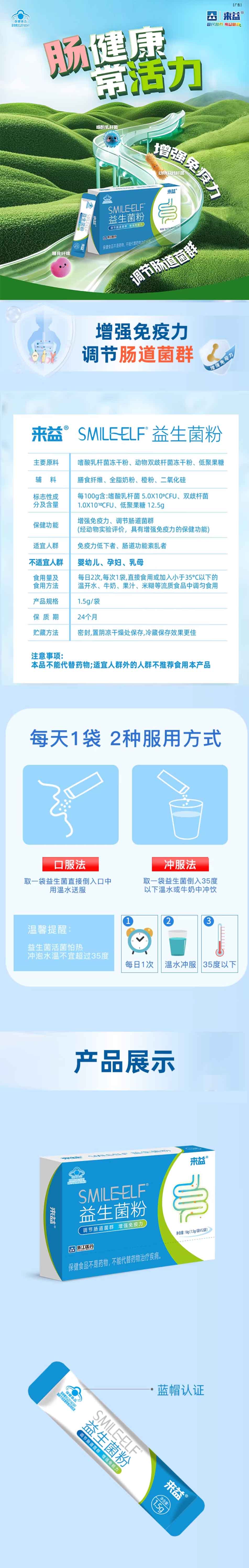 - 商品名称:来益牌SMILEELF益生菌粉-1.5g*12袋/盒